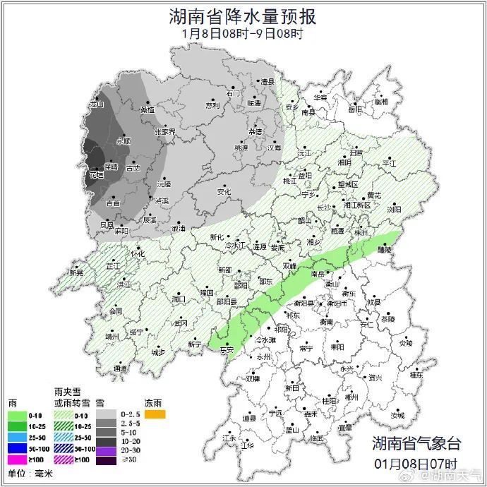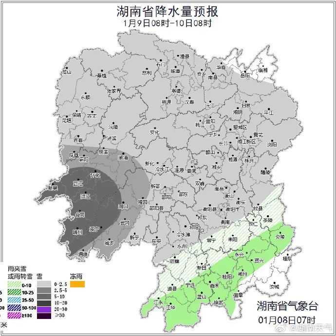 大雪、暴雪随即就来!具体天气湖南省征象台预测,8日至9日受冷空气和南支槽共同影响,全省有一次降温降雨风力加大天气流程,其中湘中、湘北有雨雪相态调整,湘西局地大到暴雪。10日受槽后西北气流结果,全省以多云到好天天气为主,湘西部分地区朝晨有雾。具体来看,今天白日到晚上,湘西北小雨转小到中等雪,其中湘西州、张家界局地大雪,龙山、永顺、花垣、保靖有暴雪,湘南多云到阴天,其他地区阴天有小雨或雨夹雪;北风3~4级,局地阵风6~7级;最低气温湘西0~2℃,其他地区3~5℃;最高气温湘西3~5℃,湘南13~15℃,其他地区7~9℃。