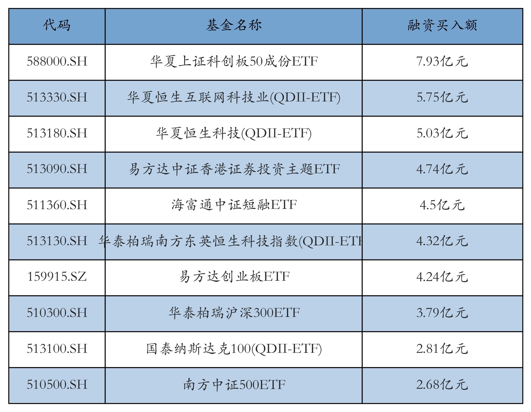1月20日ETF融资买入额前三位诀别为:中原上证科创板50成份ETF(7.93亿元)、中原恒生互联网科技业(QDII-ETF)(5.75亿元)和中原恒生科技(QDII-ETF)(5.03亿元),前10具体见下表: