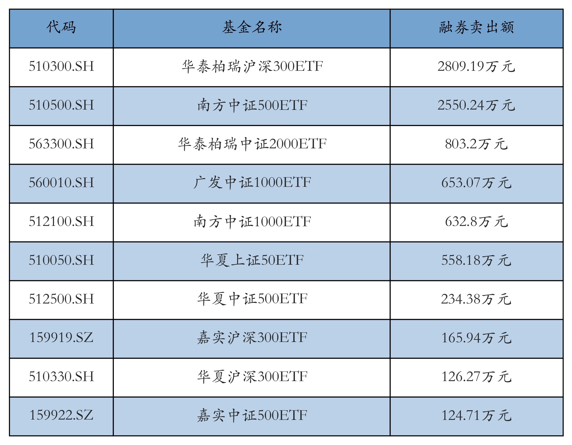 1月20日ETF融券卖出额前三位诀别为:华泰柏瑞沪深300ETF(2809.19万元)、南边中证500ETF(2550.24万元)和华泰柏瑞中证2000ETF(803.2万元),前10具体见下表: