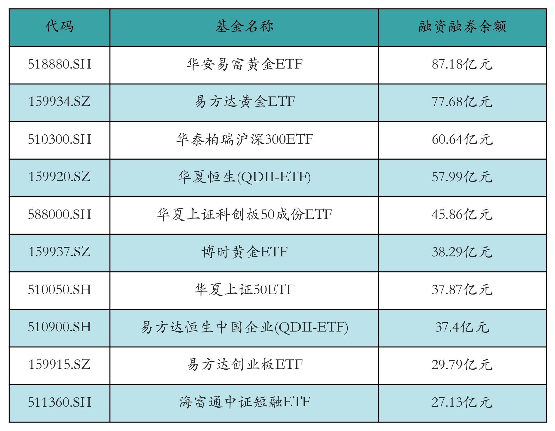 1月20日ETF两融余额前三位诀别为:华安易富黄金ETF(87.18亿元)、易方达黄金ETF(77.68亿元)和华泰柏瑞沪深300ETF(60.64亿元),前10具体见下表: