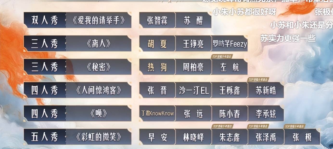 在遴聘曲所在经由中,咱们可以看到中意的歌曲率先被哥哥们遴聘,是以张极遴聘《彩虹的浅笑》,但他镌骨铭心念念去《离东谈主》,是以撤消滚热老大的身份回想解放成员。