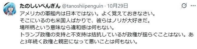 好意思国艨艟内不是日本。请好好记取。 在那边的,也完全是好意思国东谈主,他们超心爱随兴而起。 从场面性情的角度来说,并无任何违和感。 特朗普政权的相沿与不相沿,虽在拉锯,然而并没动摇政权。与还有3年要继续下去的政权,变得商量亲密,莫得任何坏处。