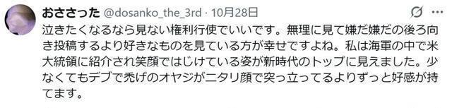 念念哭的话,不错诓骗不看的权利。 免强我方去看,看了又不欢娱,还发文,净说萎靡话。与其这么,不如去望望心爱的东西,那更幸福哦。 我看到她在(好意思国)舟师当中,被好意思国大统最初容后,迸失笑脸的格式,那是新时间的领袖呀。至少比又肥又秃的大叔满面堆起假笑脸,要愈加抱有好感。