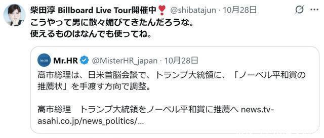 日网乡民里头,有一些清亮头脑和正常证实的,他们感受到的“日好意思一家无二”很不是味谈。当今这些“感受”正在网上豪恣发酵。 10月28日,有名创作女歌手柴田淳在X上发文评述: 就这么跟男东谈主多样谄谀,走过来的吧。能派得上用的东西,什么皆用