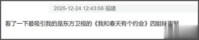 东方卫视本年倒是请到了顶流肖战,收视率基本盘是稳了。还有心扉牌,蔡晓仪、邓萃雯、商天娥、万绮雯,《我和春天有个约聚》四姐妹重聚,以及林子善良叶倩文等老牌港星压阵。