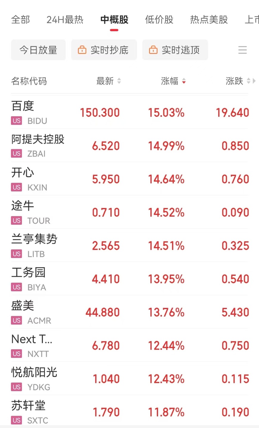 明星中概股普涨,百度收涨15%,哔哩哔哩、网易涨超7%,阿里巴巴涨超6%,京东涨近3%。
