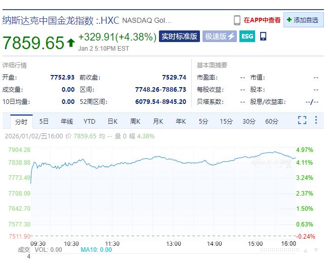 纳斯达克中国金龙指数收涨4.38%,迎来“开门红”。