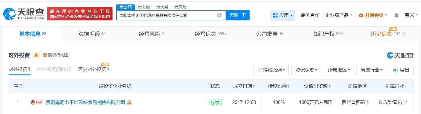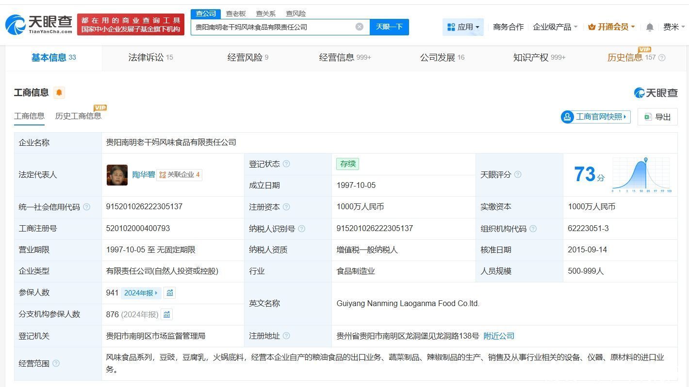 天眼查工商信息露馅,老干妈关系公司贵阳南明老干妈风范食物有限职守公司配置于1997年10月开云(中国)Kaiyun·官方网站 - 登录入口,法定代表东说念主为老干妈首创东说念主陶华碧,注册本钱1000万东说念主民币,标的界限包括标的本企业自产的粮油食物的出口业务、蔬菜成品、辣椒成品的坐褥、销售及从事行业关系的开发、仪器、原材料的入口业务等。推进信息露馅,该公司由陶华碧之子李妙行、李贵山共同抓股。对外投资信息露馅,该公司对外投资贵阳南明老干妈风范食物销售有限公司。
