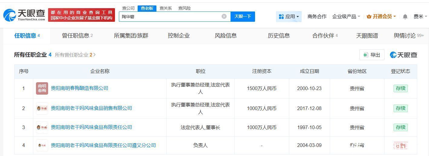 值得一提的是,陶华碧名下关系4家企业,其中3家处于存续景况,辞别是贵阳南明春梅酿造有限公司、贵阳南明老干妈风范食物销售有限公司、贵阳南明老干妈风范食物有限职守公司。